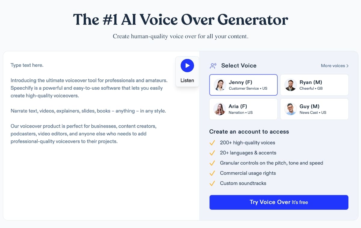 YouTubers, podcasters, and audiobook publishers rely on AI voices for narration, prototyping, and even final production. For creators, the key benefit is speed without sacrificing quality.